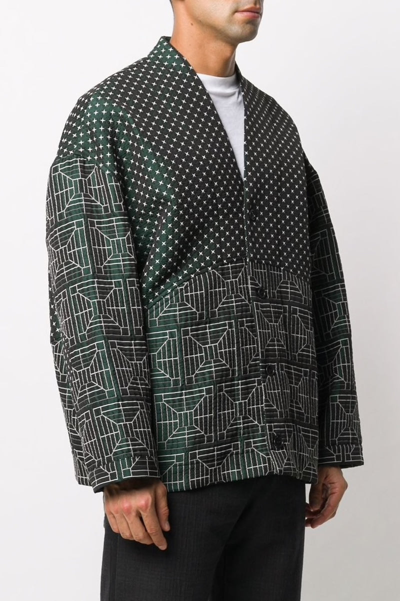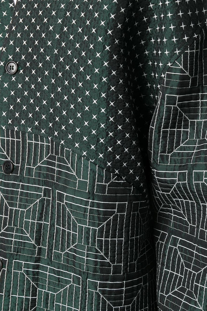 The Mirror Jacket from the Henrik Vibskov AW20 collection is a dark green jacket with long sleeves and a oversize fit. Featuring the Drain Mixer pattern.