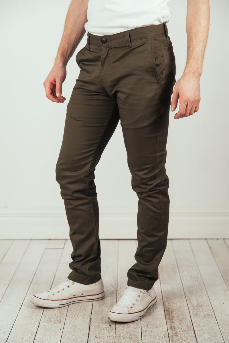 The Slim Chino in a 12oz khaki Japanese chino twill with added stretch for increased comfort. Due to a high stretch recovery performance the fabric is designed to keep its shape wear after. Other details include tonal stitching, full grain brown leather patch, zip fly, equipped with slash front pockets and welt rear pockets. The Slim Chino is a slim tapered fit; medium rise, slim thigh and taper from the knee to hem.